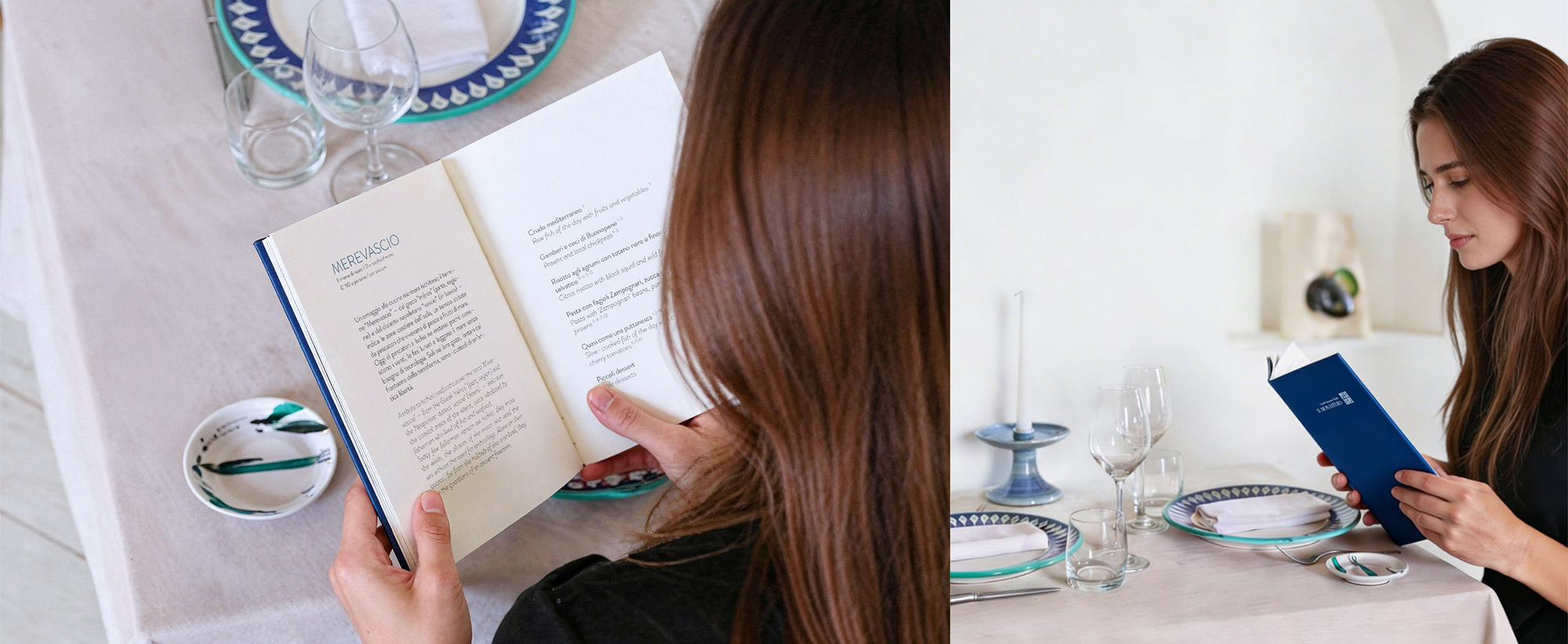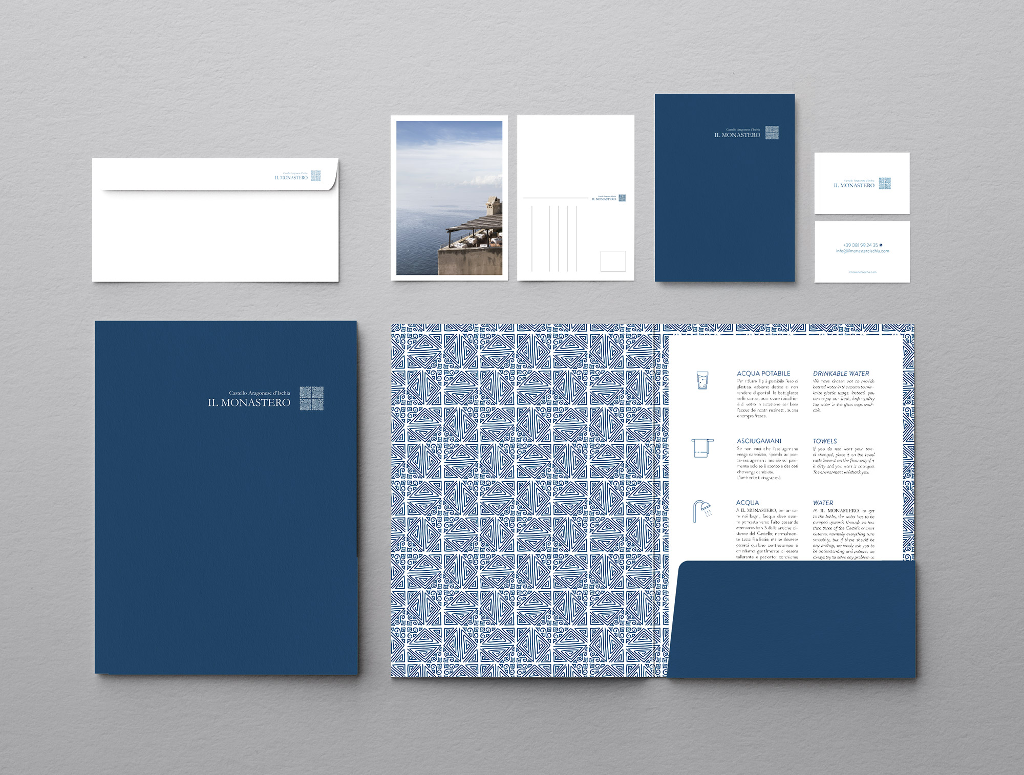 La scelta del colore blu (anche nei toni freddi delle foto usate nella comunicazione) deriva dal disegno stesso e dal mare, nel quale Il Monastero è totalmente immerso. Ad esso fa da contrappunto un intenso uso del bianco che dà luce, richiamando le atmosfere rarefatte ed eleganti di questo luogo. Anche l’uso continuo della forma quadrata ha origine dalla maiolica del marchio.