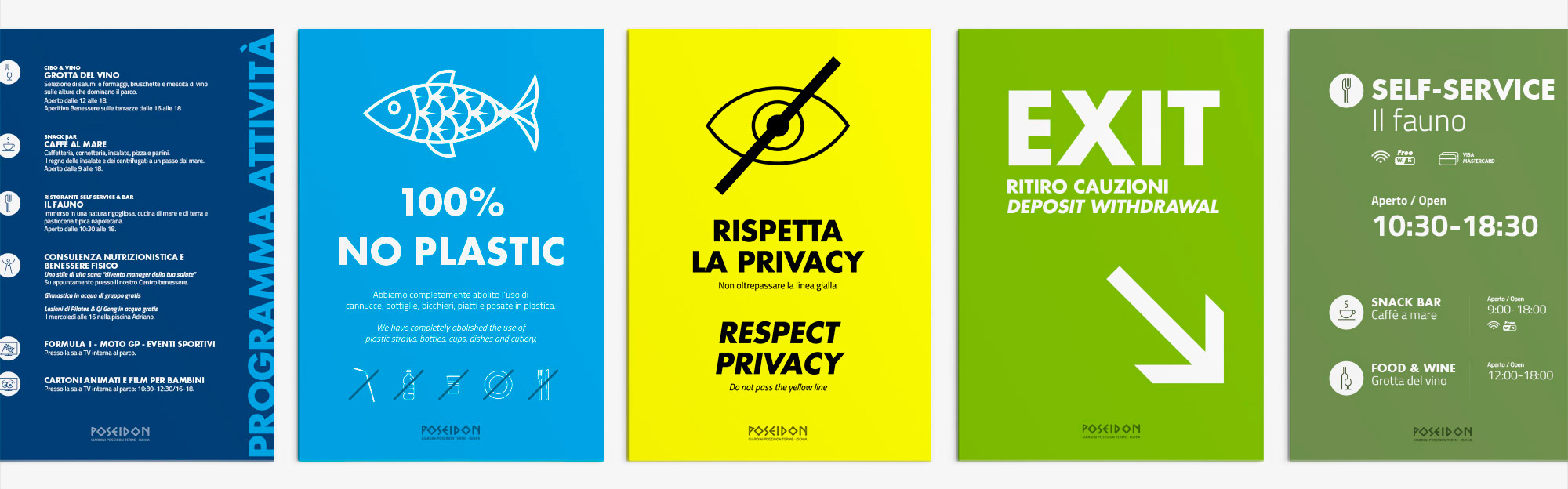 È stato inoltre studiato un sistema di segnaletica che guida i visitatori nei circa 6 ettari di parco, impiegando un set di icone disegnato su misura per le specifiche esigenze di comunicazione del parco termale e una mappa molto dettagliata.